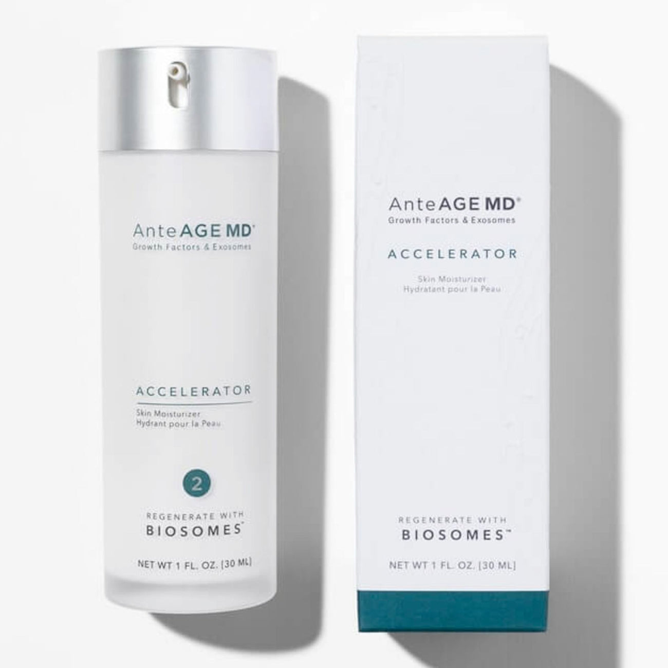 AnteAGE MD® Biosome™ Accelerator is packed with powerful actives including Biosomes™, vitamins C and E, bakuchiol, a retinol alternative, and growth factors to activate repair at the cellular level.