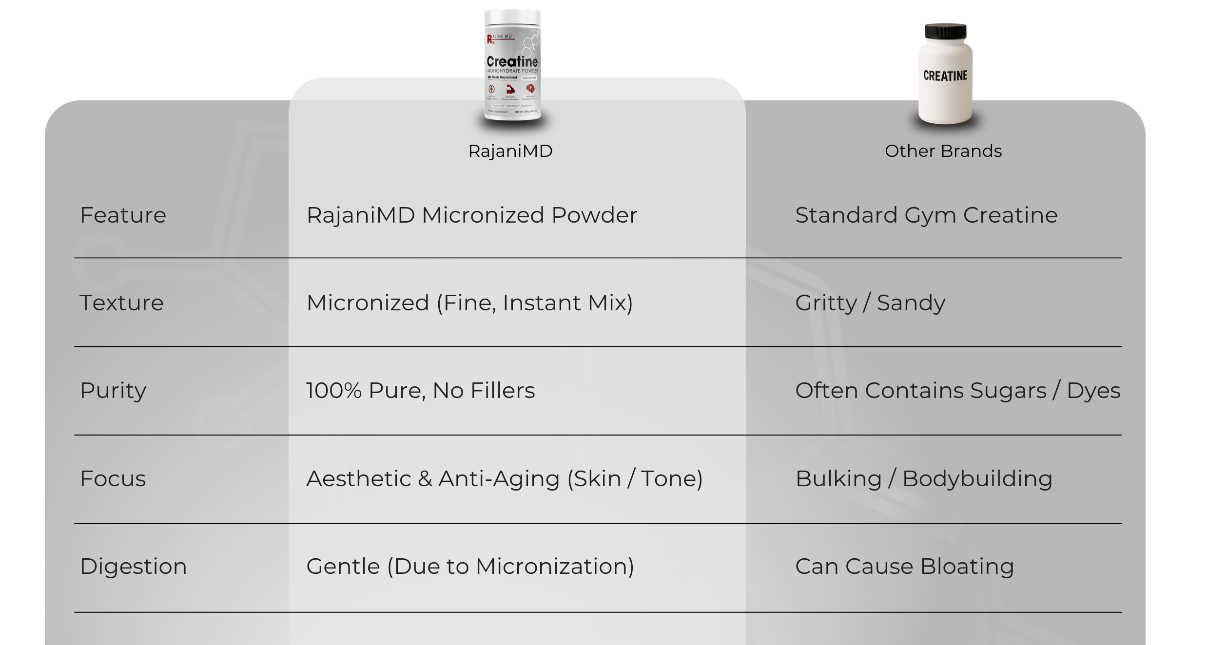 Rejuvenate From the Inside Out. True anti-aging starts beneath the skin. As we age, we lose the foundational muscle tone and cellular energy that keeps us looking lifted and vibrant. Our RajaniMD Creatine Monohydrate Powder is the purest, most versatile way to restore that foundation. Designed for women and men seeking to preserve lean muscle, enhance brain clarity, and drive hydration directly into skin cells for a firmer, plumper appearance. It’s odorless, tasteless, and dissolves instantly—making it the perfect addition to your morning coffee, smoothie, or electrolyte drink.
